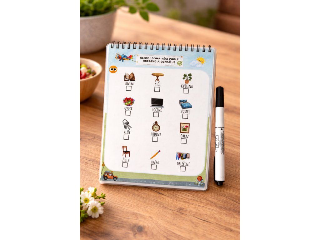 V balení najdete vše potřebné – sešit, mazací fix i hadřík.