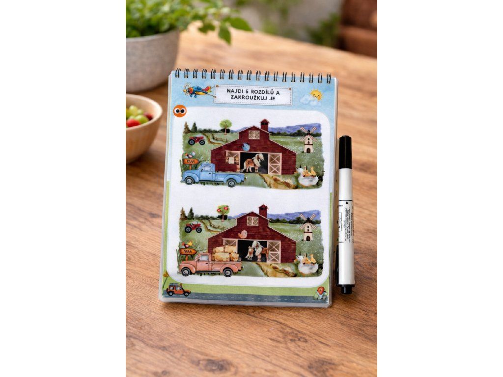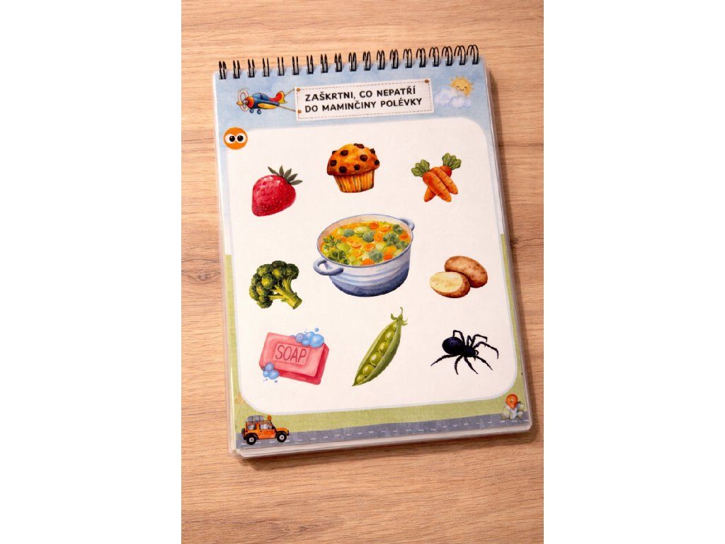 Sešit je dodáván jako hotový produkt – zalaminovaný, svázaný v kroužkové vazbě a připravený k okamžitému použití. Součástí balení je mazací fix a hadřík, takže dítě může začít ihned.